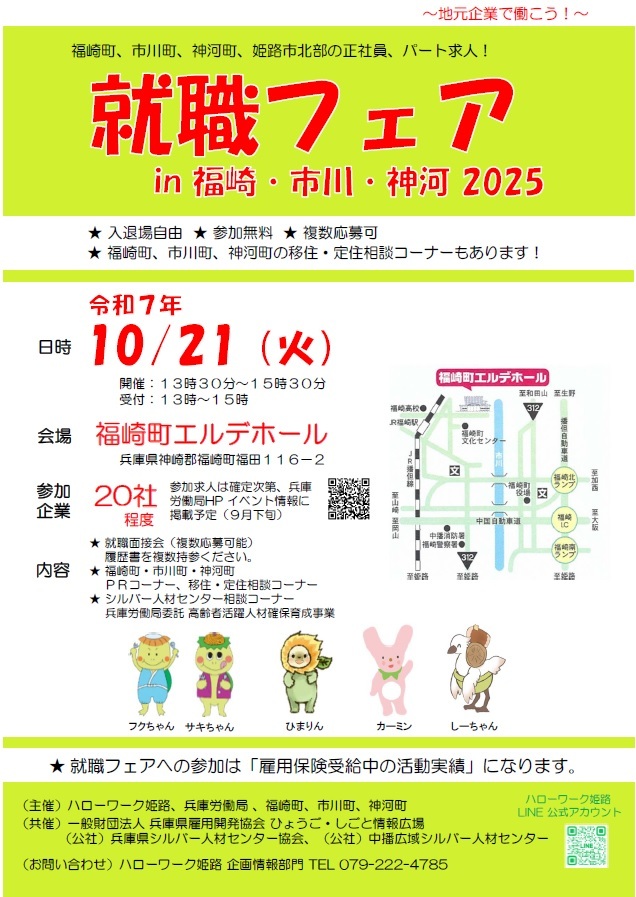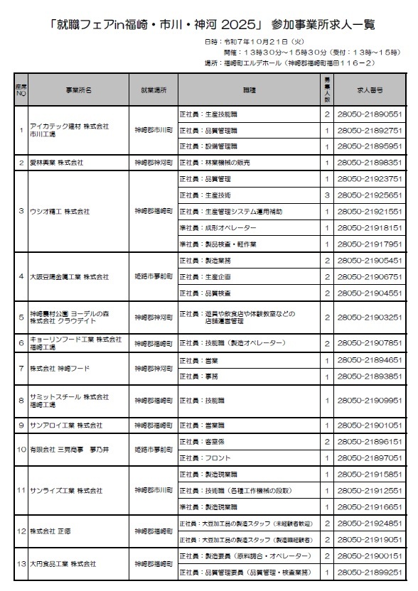 神崎郡(福崎町・市川町・神河町)で仕事を探している方を対象に、3町の企業20社が集まった就職面接会『就職フェアin福崎・市川・神河2025』を開催します。