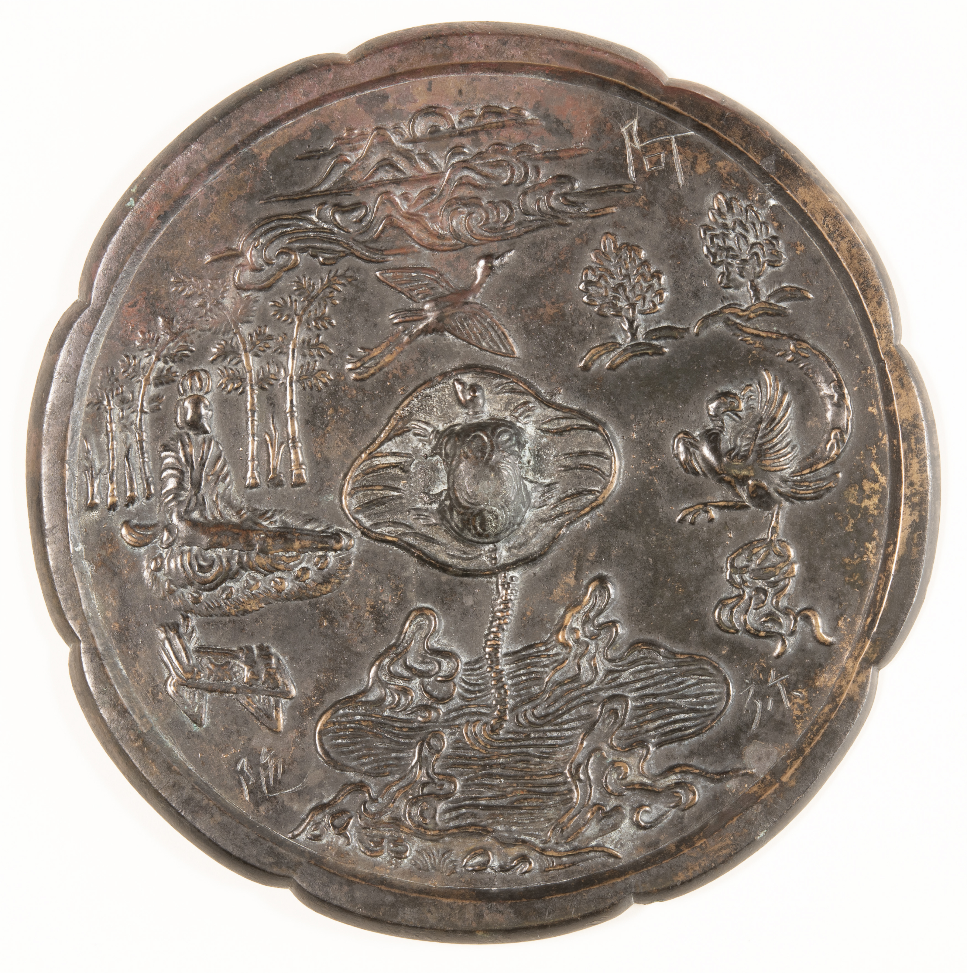 ※伯牙弾琴八花鏡…鏡の裏面に琴の名手である伯牙という人物が琴を弾くさまを表現し、輪郭が8枚の花びらのような形状になった鏡。