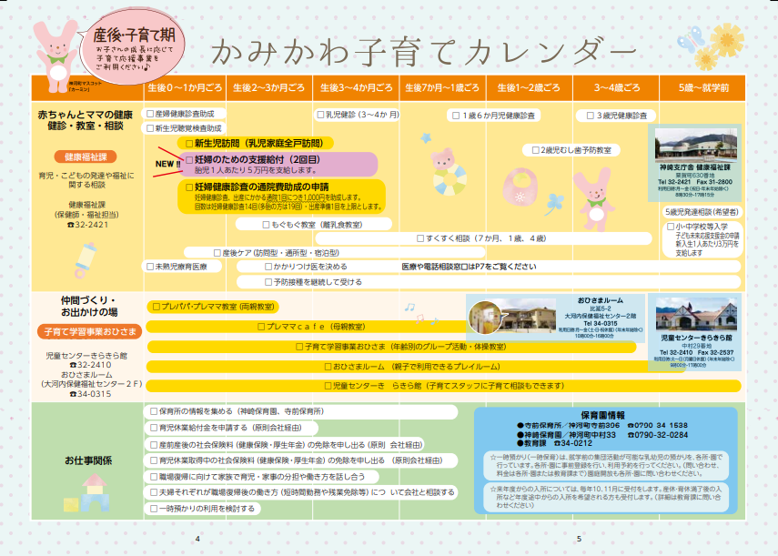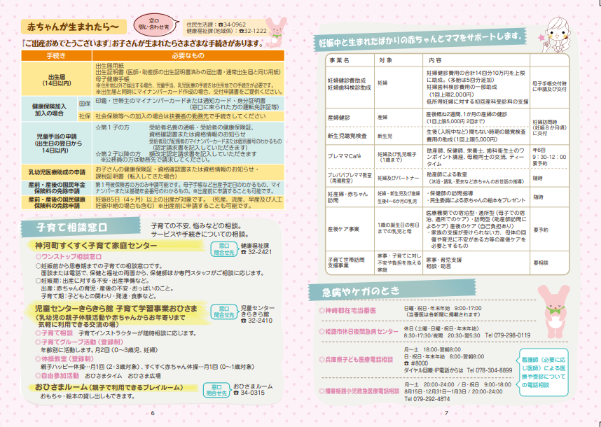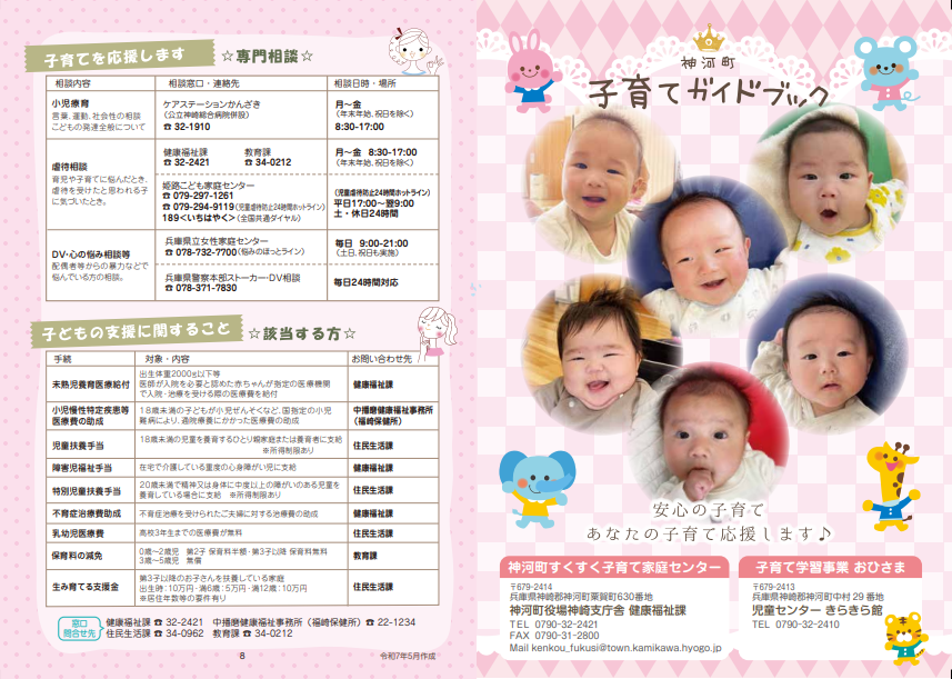 神河町では、これから子どもを生み育てる方や子育て中の方が、安心して子どもを生み、健やかに子育てができるように「神河町子育てガイドブック」を発行しています。