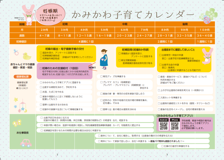 妊娠期・産後・子育て期の子育てカレンダーや、手続きの案内、相談窓口など、さまざまな情報が詰まっている一冊です。皆さまのお役に立てることを願っています。