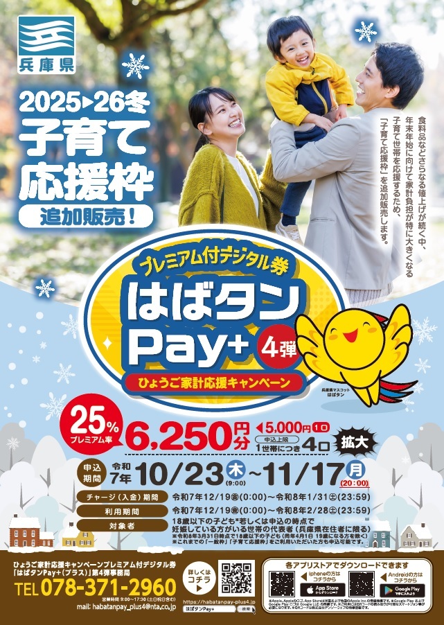 兵庫県では、食料品価格のさらなる値上げなど、長期化する物価高騰の影響が特に大きい子育て世帯を応援するため、「はばタンPay+」第4弾をさらに拡充し、家計支出が最も大きくなる年末年始に合わせた「子育て応援枠の追加販売」が実施されます。