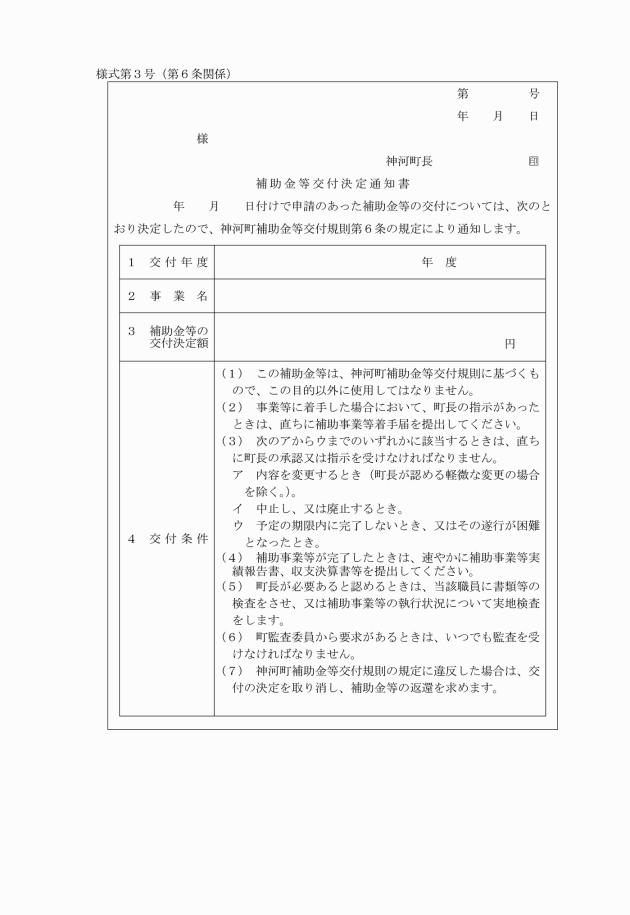 (2) 補助事業等を中止し、又は廃止しようとするときは、補助事業等中止(廃止)申請書(様式第7号)により町長の承認を受けること。