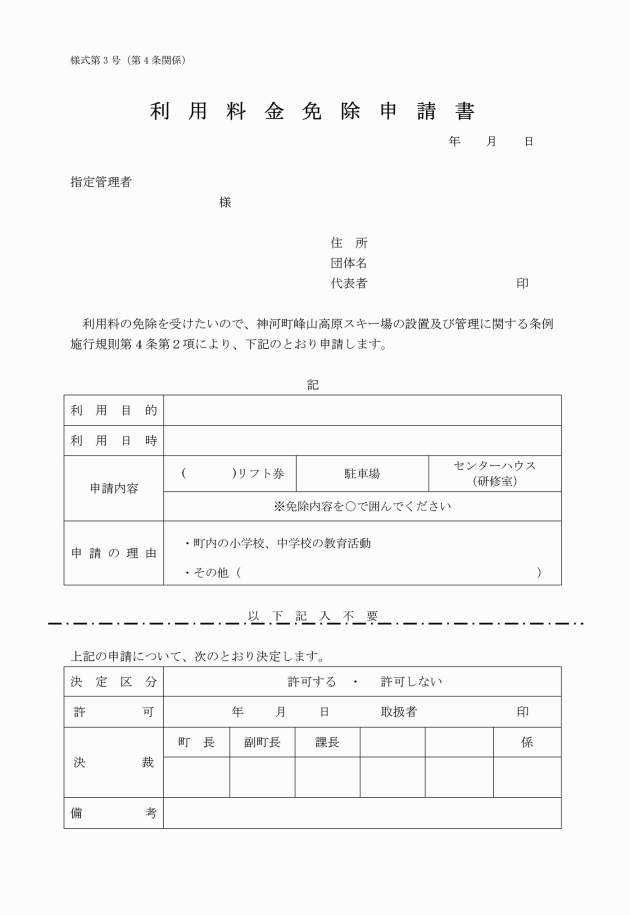 第2条 スキー場の全部又は一部を独占して利用しようとする者は、利用しようとする7日前までに指定管理者にスキー場利用許可申請書(様式第1号)を提出しなければならない。許可に係る事項を変更するときも同様とする。