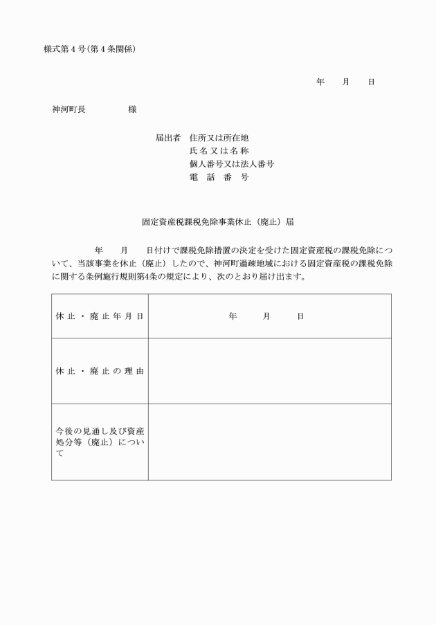 (2) 申請に係る事業を休止し、又は廃止したとき 固定資産税課税免除事業休止(廃止)届(様式第4号)