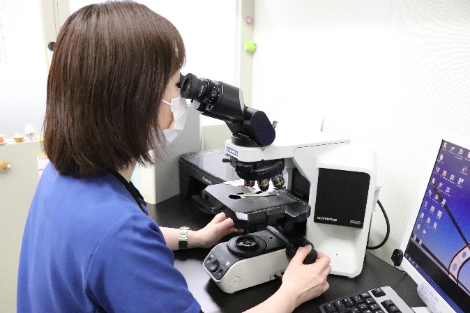 装置では、正常ではない細胞まで分類することができないため人の目で確認する必要があります。顕微鏡で観察するときは、分類しやすいように細胞を染めてから観察します。細胞を染めるのに約20分かかります。